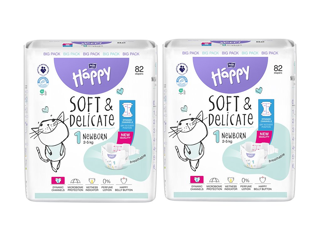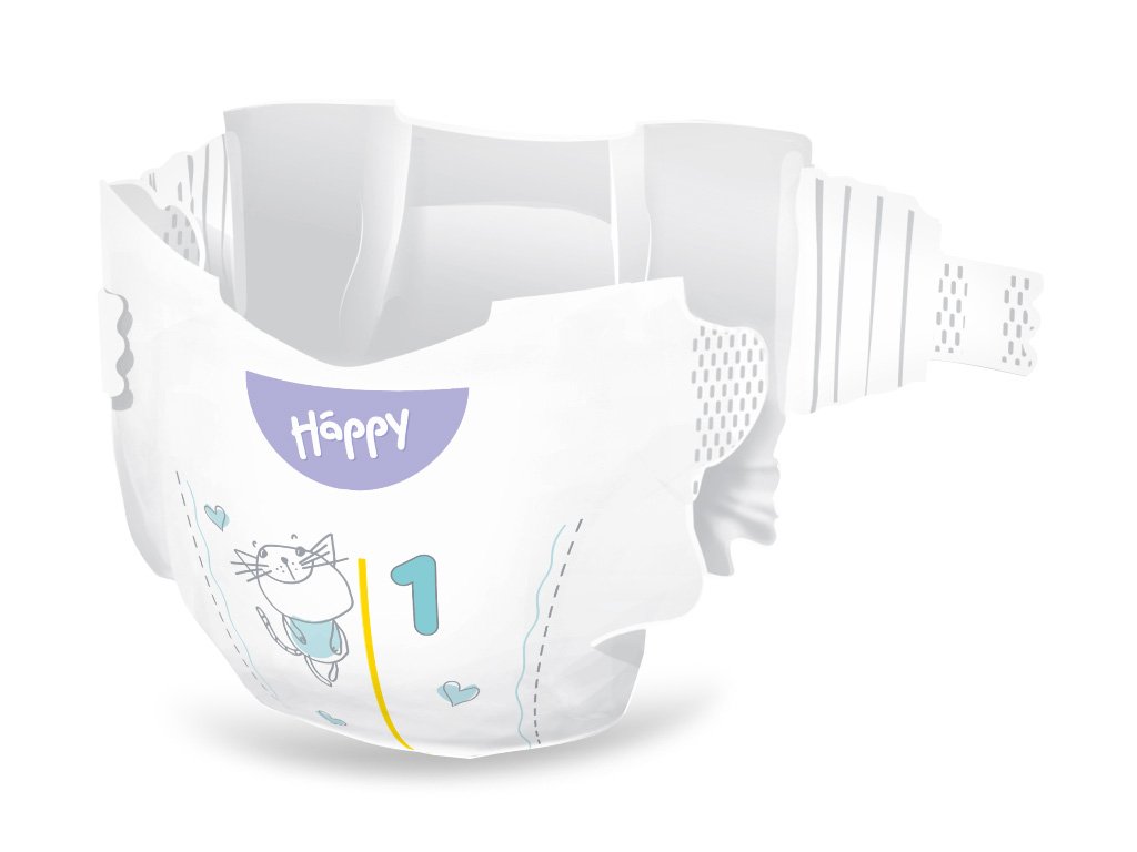 Plienky Happy Soft & Delicate Newborn boli navrhnuté pre novorodencov s váhou od 2 do 5 kg. Keďže novorodenci a dojčatá vyžadujú zvláštnu starostlivosť, boli najmenšie veľkosti plienok Happy vybavené špeciálnym výrezom na pupok. Sú ľahké, tenké a priedušné. So superabsorbentom je pokožka bábätka rýchlo v suchu. Keďže je pokožka bábätka citlivá a náchylná voči podráždeniu, preto je v tomto období obzvlášť dôležité dostatočne časté prebaľovanie. Indikátor vlhkosti na plienkach vám umožňuje presne určiť, kedy treba plienku vymeniť a kedy je ešte čas nechať bábätko v pokoji spinkať. Sú neparfumované a neobsahujú alergény. Na plienkach veľ. 1 vás bude sprevádzať roztomilá mačička.