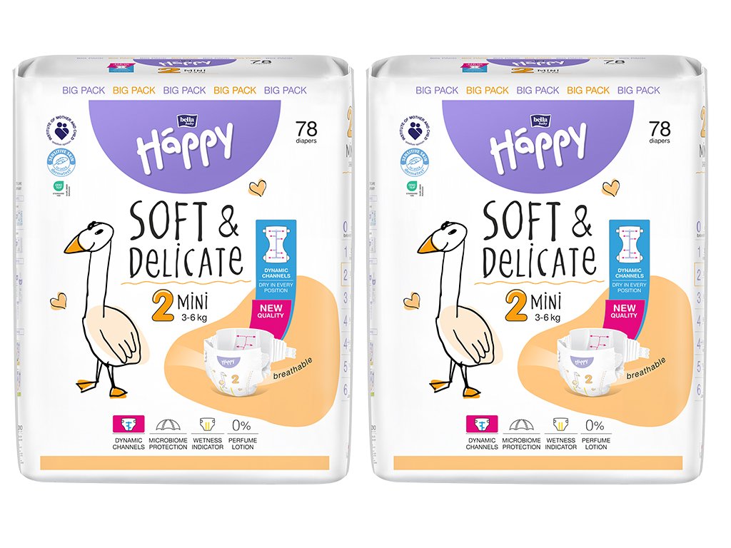 Plienky Happy Soft & Delicate Mini boli navrhnuté pre novorodencov a dojčatá s váhou od 3 do 6 kg. Sú ľahké, tenké a priedušné. So superabsorbentom je pokožka bábätka rýchlo v suchu. Keďže je pokožka bábätka citlivá a náchylná voči podráždeniu, preto je v tomto období obzvlášť dôležité dostatočne časté prebaľovanie. Indikátor vlhkosti na plienkach vám umožňuje presne určiť, kedy treba plienku vymeniť a kedy je ešte čas nechať bábätko v pokoji spinkať. Sú neparfumované a neobsahujú alergény. Na plienkach veľ. 2 vás bude sprevádzať oranžová hus.