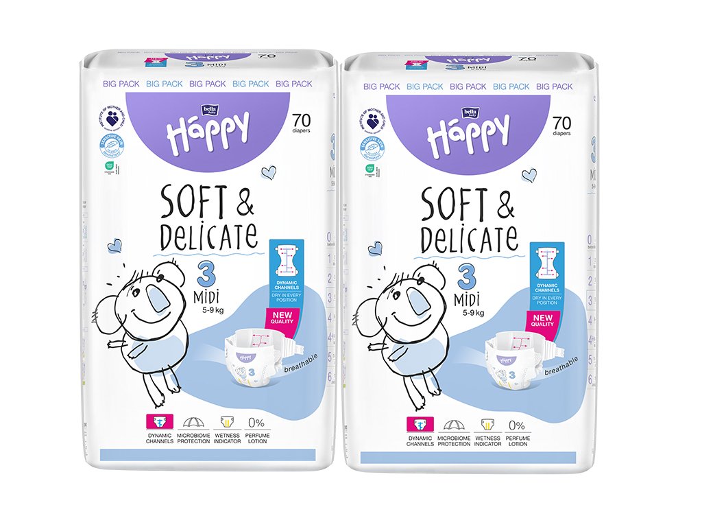 Plienky Happy Soft & Delicate Midi boli navrhnuté pre dojčatá a batoľatá s váhou od 5 do 9 kg. Sú ľahké, tenké a priedušné. So superabsorbentom je pokožka bábätka rýchlo v suchu. Keďže je pokožka dieťaťa citlivá a náchylná voči podráždeniu, tak je dobré vedieť, kedy dieťa prebaliť. Indikátor vlhkosti na plienkach vám umožňuje presne určiť, kedy treba plienku vymeniť alebo kedy ešte nie je ten čas rušiť dieťa s výmenou plienky. Sú neparfumované a neobsahujú alergény. Na plienkach veľ. 3 vás bude sprevádzať tancujúca panda.
