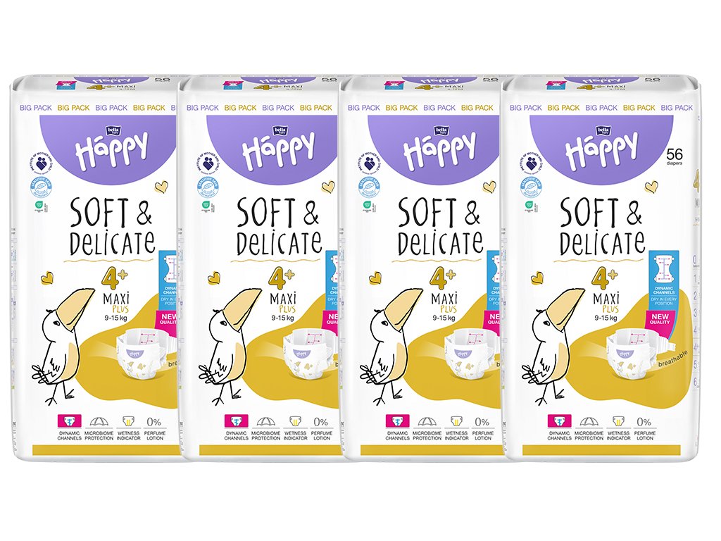 Plienky Happy Soft & Delicate Maxi Plus boli navrhnuté pre deti s váhou od 9 do 15 kg. Sú ľahké, tenké a priedušné. So superabsorbentom je pokožka bábätka rýchlo v suchu. Keďže je pokožka dieťaťa citlivá a náchylná voči podráždeniu, tak je dobré vedieť, kedy dieťa prebaliť. Indikátor vlhkosti na plienkach vám umožňuje presne určiť, kedy treba plienku vymeniť alebo kedy ešte nie je ten čas rušiť dieťa s výmenou plienky. Sú neparfumované a neobsahujú alergény. Na plienkach veľ. 4+ vás bude sprevádzať vtáčik.