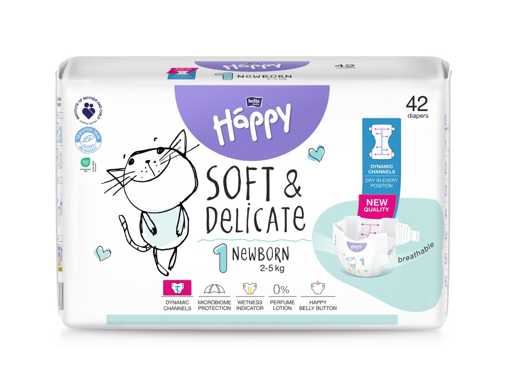 Plienky Happy Soft & Delicate Newborn boli navrhnuté pre novorodencov s váhou od 2 do 5 kg. Keďže novorodenci a dojčatá vyžadujú zvláštnu starostlivosť, boli najmenšie veľkosti plienok Happy vybavené špeciálnym výrezom na pupok. Sú ľahké, tenké a priedušné. So superabsorbentom je pokožka bábätka rýchlo v suchu. Keďže je pokožka bábätka citlivá a náchylná voči podráždeniu, preto je v tomto období obzvlášť dôležité dostatočne časté prebaľovanie. Indikátor vlhkosti na plienkach vám umožňuje presne určiť, kedy treba plienku vymeniť a kedy je ešte čas nechať bábätko v pokoji spinkať. Sú neparfumované a neobsahujú alergény. Na plienkach veľ. 1 vás bude sprevádzať roztomilá mačička.