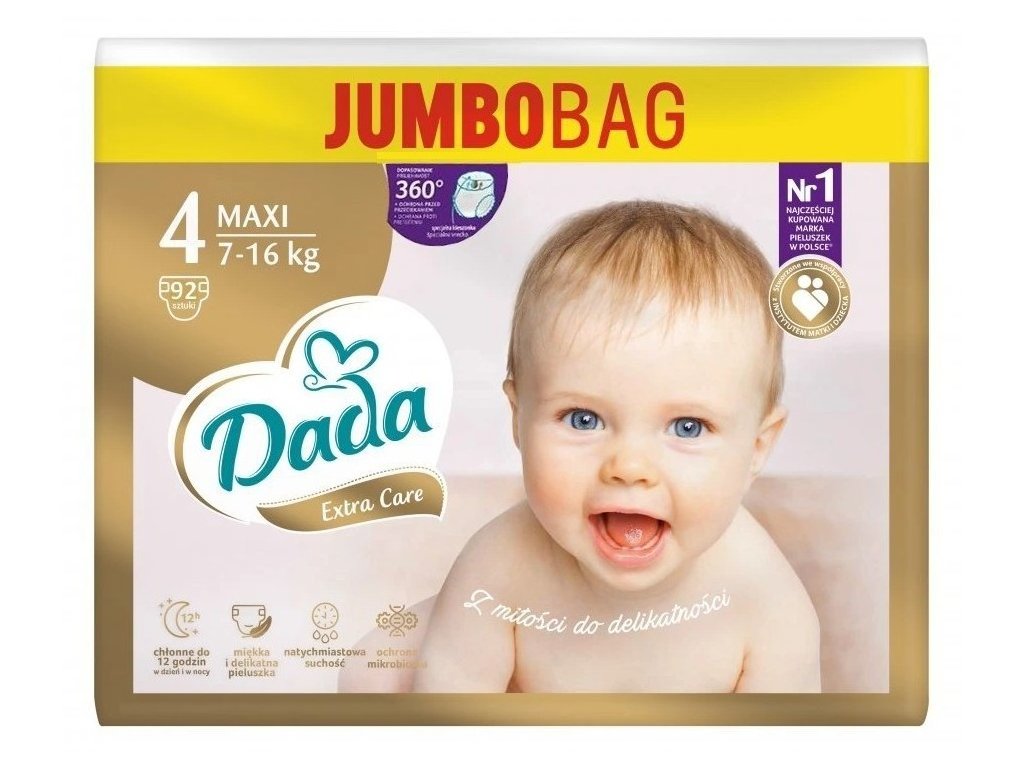 Plienky majú žltý indikátor vlhkosti, ktorý zmodrá keď je plienka plná a je potrebné ju vymeniť. V porovnaní s plienkami Dada Extra care (staršia verzia) sú 2x rýchlejšie suché, čo zaistí okamžitý komfort pokožky. Super absorpčné kanáliky = rovnomerná absorpcia tekutiny. Vďaka mäkkému a jemnému povrchu plienky s vitamínom E a priedušných materiálov sa bábätko bude cítiť ako v bavlnke. Pri výrobe plienky boli novo použité 4 technológie a to: technológia SeconDry - okamžitá suchosť, technológia Double Lock Layer - inovatívna absorpčná vložka pre spoľahlivú ochranu proti vlhkosti, technológia Wee Zones - efektívny odvod vlhkosti pre dievčatá i chlapcov a technológie Climaflex - účinný odvod vlhkosti a tepla, aby sa zabránilo podráždeniu. Pre ešte lepšiu ochranu a hygienu majú plienky vzadu a vpredu vrecká, ktoré spolu s volánikmi proti pretečeniu poskytujú 360° ochranu proti pretečeniu. Produkt je bez parfumácie, aby sa minimalizovalo riziko alergickej reakcie (neobsahuje alergény zo zoznamu 26 potenciálnych alergénov) a je vyrobený bez použitia molekulárneho chlóru. Ochrana mikrobiomu - plienky pomáhajú udržiavať normálnu fyziologickú flóru pokožky, vďaka čomu bude stále zdravá av dobrej kondícii. Výrobok je vytvorený v továrňach využívajúcich elektrinu z obnoviteľných zdrojov.Celulóza použitá na výrobu bola získaná z udržateľného lesného hospodárstva spravovaného zodpovedne az kontrolovaných zdrojov (certifikát PEFC).