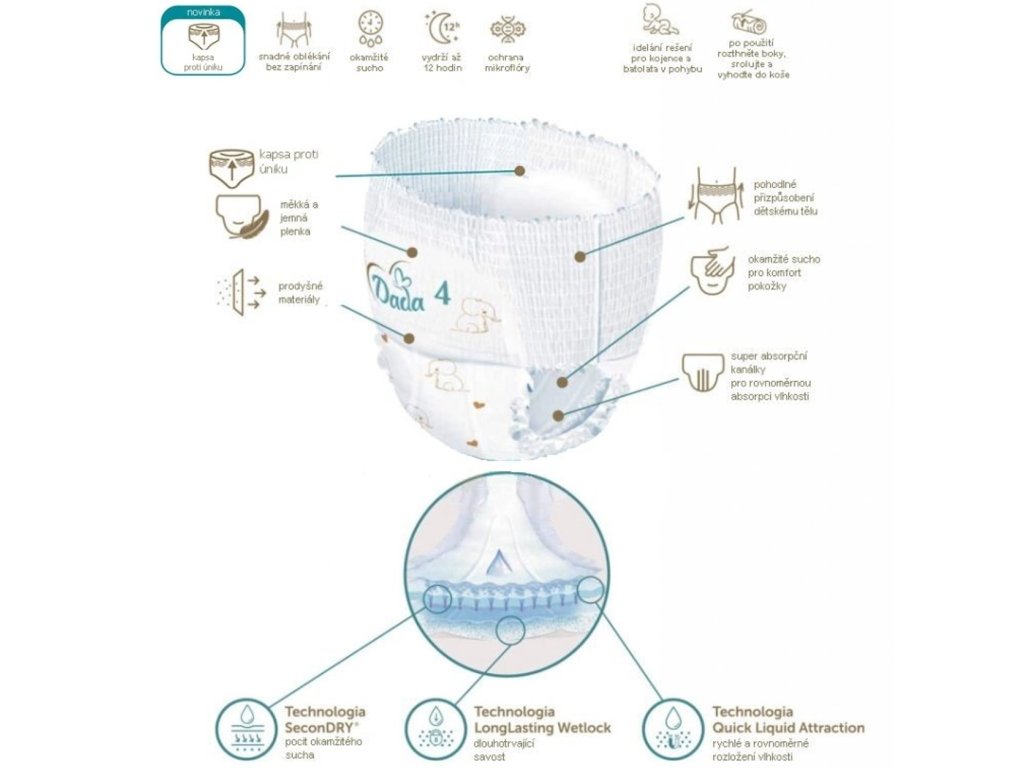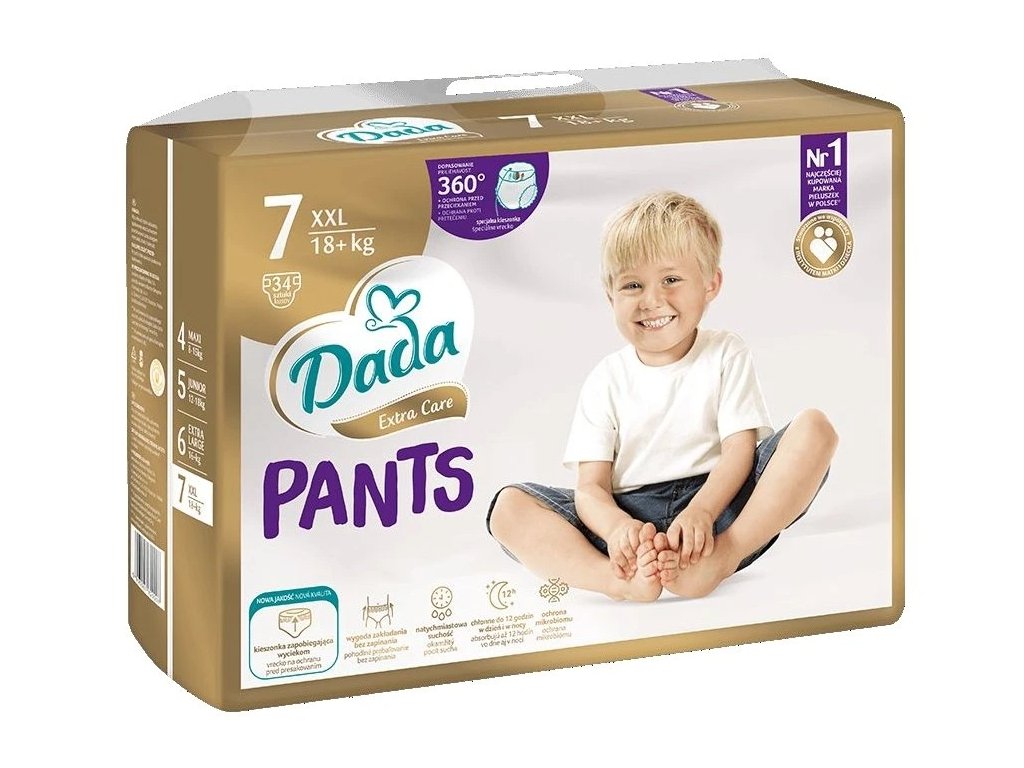 Plienkové nohavičky Dada Extra care veľ. 7 sú navrhnuté pre deti s váhou väčšou ako 18 kg a sú vhodné pri prvých krôčikoch, pri učení dieťaťa na nočník (zvyká si na spodnú bielizeň) alebo keď sú bábätká neposedné (jednoducho navlečiete a máte hotovo). Sú rovnako kvalitné ako štandardné plienky Dada Extra care. Výhoda oproti klasickým plienkam je v prebaľovaní, kedy dieťaťu pants jednoducho natiahnete ako nohavičky a keď sú plné, stačí roztrhnúť boky, zložiť ich, zavinúť, zalepiť páskou a vyhodiť do koša. Pants zaisťujú bábätku okamžitú suchosť a sú savé až 12 hodín cez deň aj v noci. Majú žltý indikátor vlhkosti, ktorý zmodrie keď je plienka plná a je potrebné ju vymeniť. Super absorpčné kanáliky = rovnomerná absorpcia tekutiny. Vďaka mäkkému a jemnému povrchu plienky a priedušným materiálom sa bábätko bude cítiť ako v bavlnke. Pri výrobe nohavičiek boli použité 3 technológie a to: technológia SeconDry - okamžitá suchosť, technológia Longlasting Wetlock - dlhodobá absorpcia a technológia Quick Liquid Attraction - rýchle a rovnomerné rozloženie vlhkosti. Teraz pre ešte lepšiu ochranu a hygienu majú nohavičkové plienky vrecko (vak), ktoré spolu s volánikmi proti pretečeniu poskytujú 360 ° ochranu proti pretečeniu. Sú veľmi flexibilné, prispôsobujú sa pohybu dieťaťa a vďaka pružnému pásu zaručujú komfort, ktorý si bábätko zaslúži. Produkt je bez parfumácie, aby sa minimalizovalo riziko alergickej reakcie (neobsahuje alergény zo zoznamu 26 potenciálnych alergénov) a je vyrobený bez použitia molekulárneho chlóru. Ochrana mikrobiómu - plienky pomáhajú udržiavať normálnu fyziologickú flóru pokožky, vďaka čomu bude stále zdravá a v dobrej kondícii. Výrobok je vytvorený v továrňach využívajúcich elektrinu z obnoviteľných zdrojov. Celulóza použitá na výrobu bola získaná z udržateľného lesného hospodárstva spravovaného zodpovedne a z kontrolovaných zdrojov (certifikát PEFC).