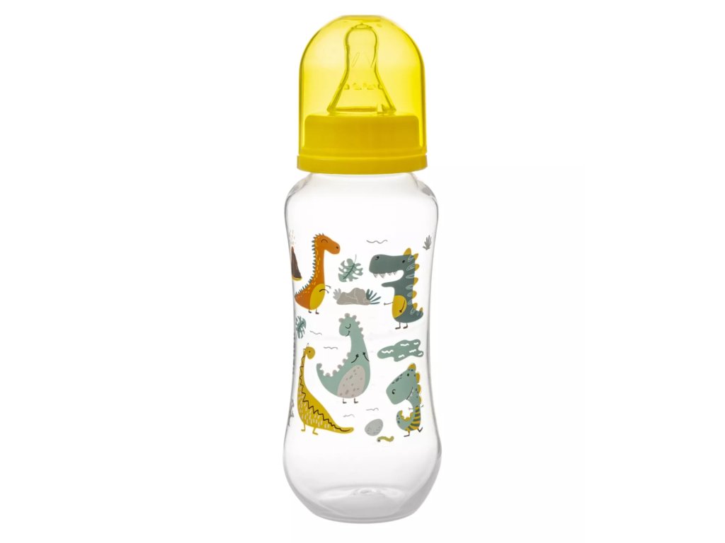 Plastová fľaša značky Akuku s obrázkom dinosaurov vhodná od narodenia. Fľaša obsahuje žltý uzáver, veselé obrázky a silikónový cumlík s pomalou rýchlosťou prietoku. Obsah fľaštičky je 250 ml. Neobsahuje BPA. Zloženie: polypropylén.