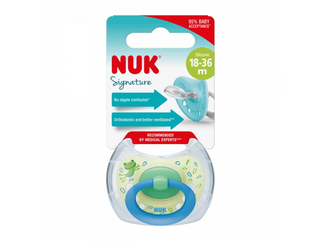 Cumlík cumlíka NUK Signature je natoľko plochý, tenký a úzky, že dokonale padne bábätku do pusy a necháva jazyku dostatok miesta pre prirodzené sacie pohyby. 100% ortodontistov uznáva, že toto je ten správny tvar, a potvrdzujú, že cumlíky NUK nespôsobujú poškodenie zúbkov ani čeľuste.*