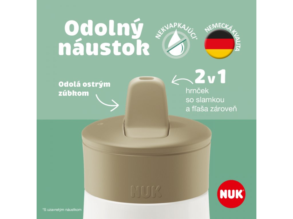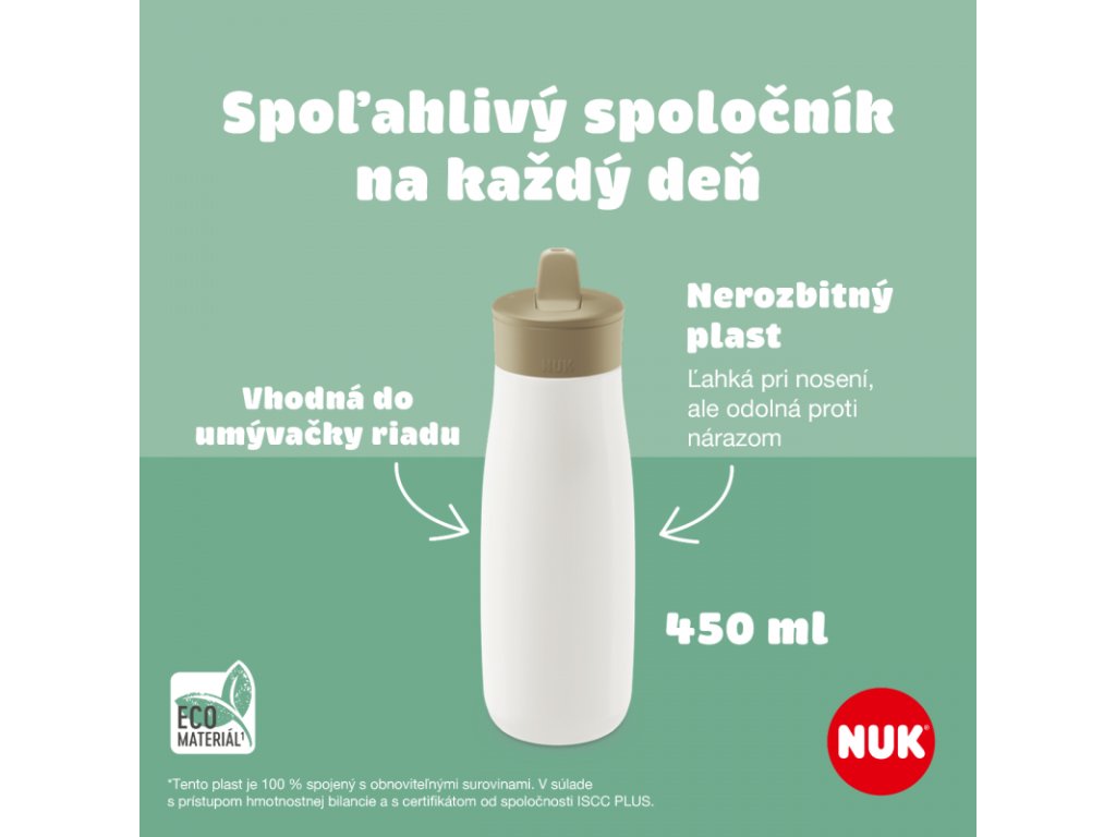 Je príjemné, keď sa detská fľaštička na pitie páči nielen deťom, ale aj rodičom. Nová fľaša NUK Mini-Me Flip je vhodná pre deti od 12 mesiacov. Vhodná pre deti – moderným a minimalistickým spôsobom. Praktická a zároveň štýlová. Nerozbitný plast je vyrobený z viac ako 80 % z udržateľných materiálov*. Vďaka inovatívnemu náustku 2v1 si deti môžu vybrať, či budú piť zo slamky alebo nie. V každom prípade materiál odolný proti hryzeniu ľahko odolá malým zúbkom. Jasný záväzok k udržateľnosti a kvalite.
