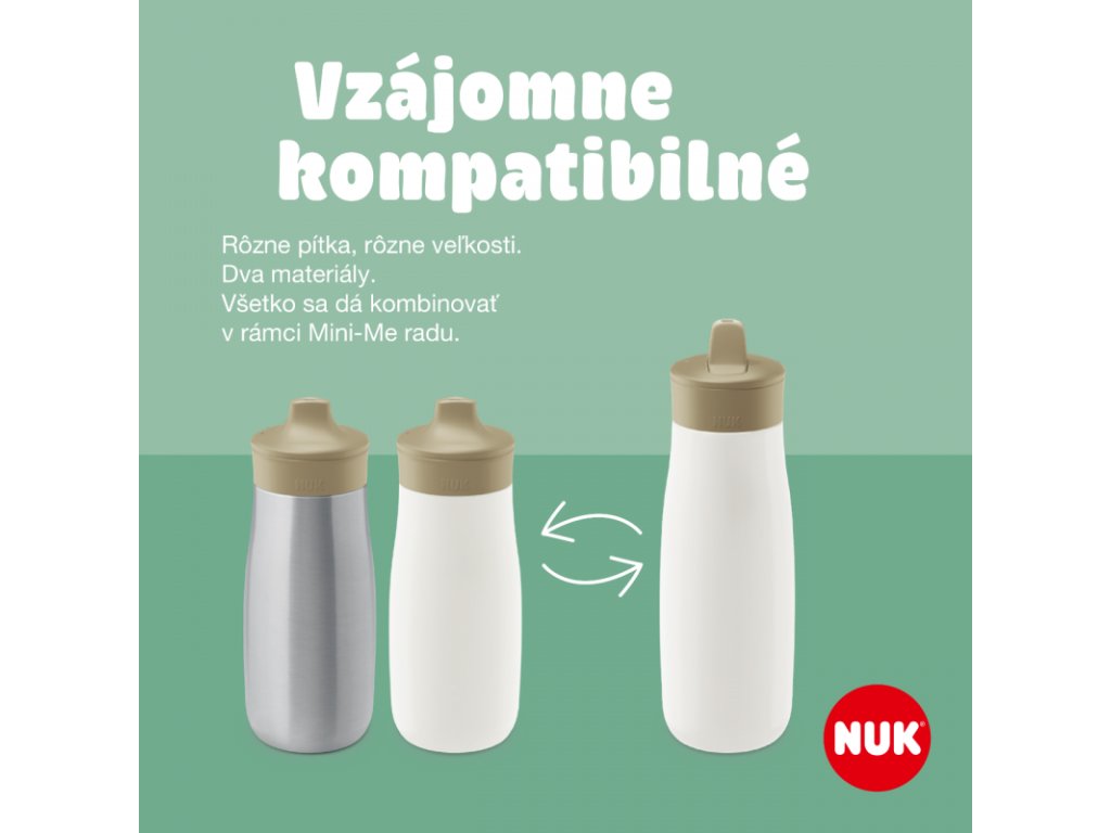 NUK Mini-Me je systém, ktorý rastie spolu s dieťaťom. Vyberať môžete medzi nerezovou oceľou a nerozbitným plastom. Vyberte si z rôznych veľkostí. Zvoľte si pevné alebo vyklápacie náustok. A môžete si zostaviť presne takú fľašu, akú pre svoje dieťa potrebujete. Fľaša je netečúca a veľmi odolná, nech už si vyberiete akýkoľvek model. Stvorená pre prvé dobrodružstvo a všetko, čo príde po nich.