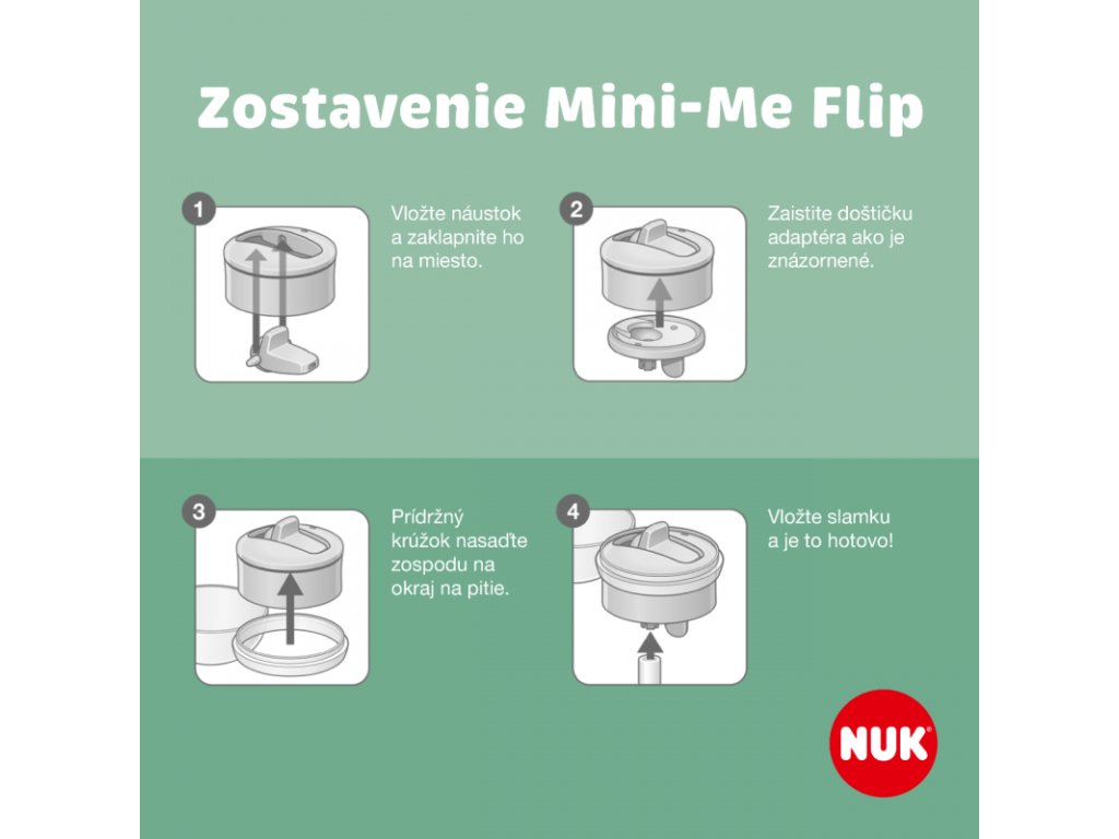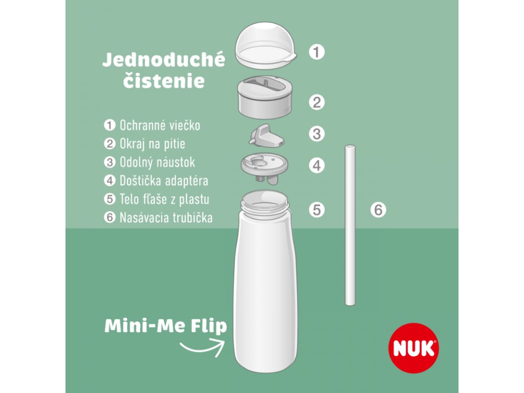 Fľaša NUK Mini-Me Flip nie je určená na horúce ani sýtené nápoje. Starostlivo si prečítajte priložené pokyny a varovania. Informácie o produkte a číslo výrobku si uchovajte pre budúce použitie. Fľaše na pitie a pítka NUK sú kompatibilné iba s príslušným výrobkovým radom.