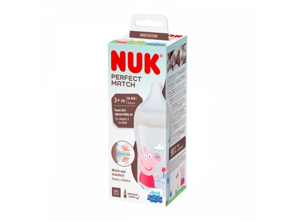 Dojčenská fľaša NUK Perfect Match Prasiatko Peppa, s mäkkým silikónovým cumlíkom, s objemom 260 ml, vhodná od 3 mesiacov, neobsahuje BPA, má antikolikový systém a je s kontrolou teploty
