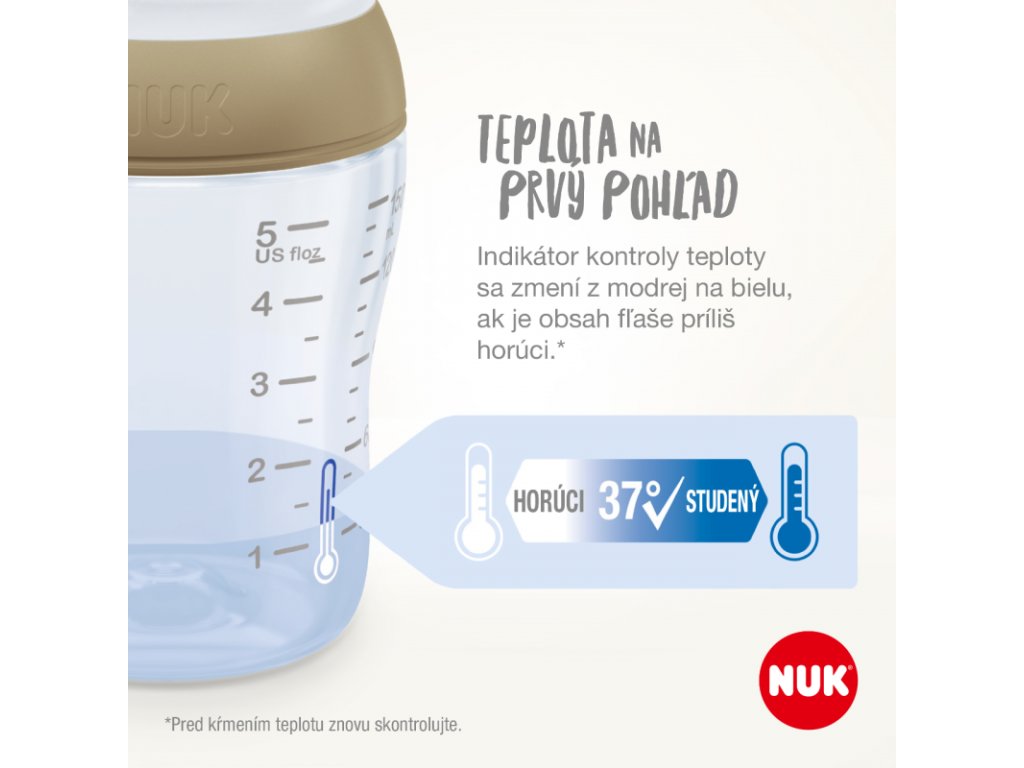 Inovatívny indikátor kontroly teploty NUK, ktorého farba sa zmení z modrej na bielu, pokiaľ je obsah fľaštičky príliš horúci. Je príjemné vedieť, že nekŕmite príliš horúcim mliekom.