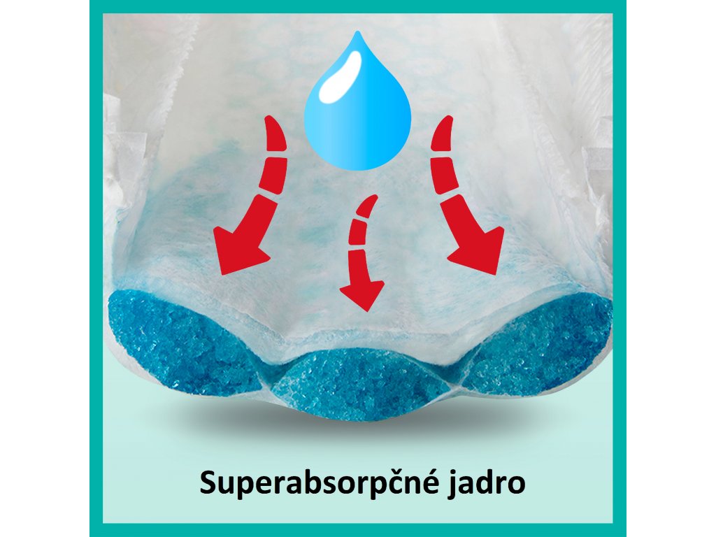 Až 12hodinová úplná ochrana proti pretečeniu vďaka Vrecku Stop & Protect, supersbsorpčnému jadru a dvojitým manžetkám okolo nožičiek - Vrecko pomáha predchádzať pretečeniu vzadu a manžetky predchádzajú pretečeniu okolo nožičiek. Jadro okamžite absorbuje tekutinu a odvávi ju ďaleko od pokožky bábätka.