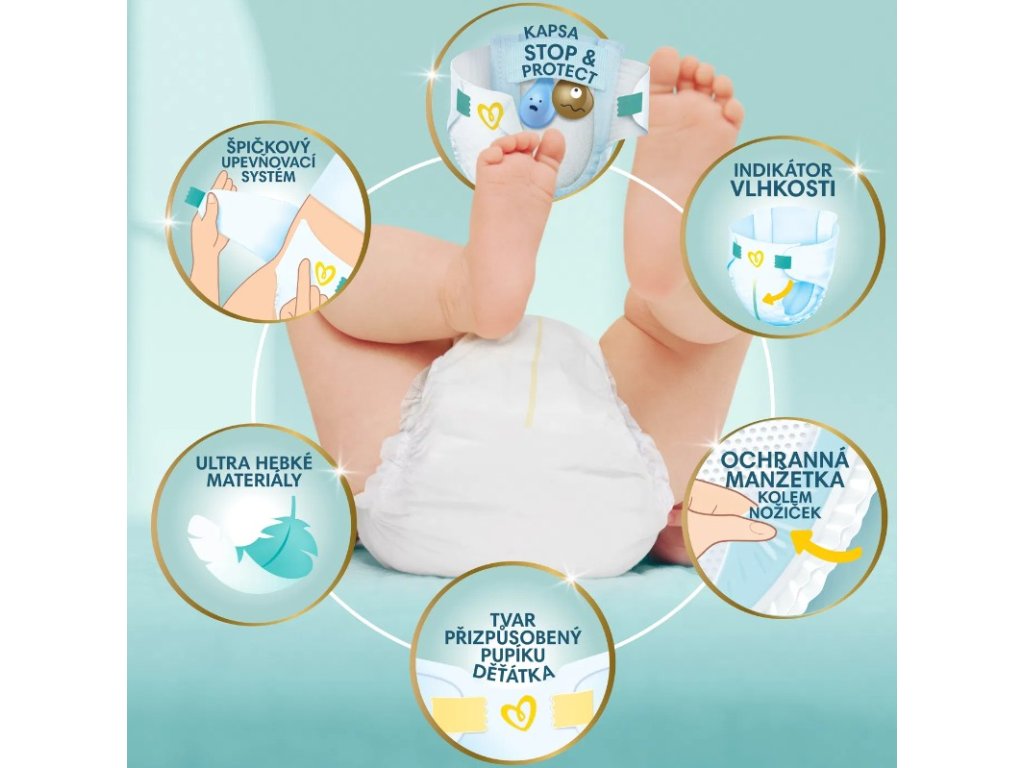 Plienky Premium Care sú najlepšie plienky značky Pampers s 5hviezdičkovou ochranou pokožky, ktoré poskytujú hodvábnu jemnosť na vnútornej aj vonkajšej strane plienky. Plienky boli špeciálne navrhnuté pre pokožku novorodenca, s hodvábne hebkou povrchovou vrstvou a 3 absorpčnými kanálikmi, ktoré rýchlo absorbujú vlhkosť pre okamžitý pocit sucha a zaisťujú až 12 hodín nepretržitej suchosti. Plienky majú navyše vrecko Stop & Protect, ktoré pomáha predchádzať pretečeniu vzadu. Najhebšie pohodlie vďaka exkluzívnej vrstve DermaComfort s absorpčnými pórmi, ktoré odvádzajú vlhkosť a nečistoty od pokožky a uzatvárajú ich vo vnútri plienky. Aby mohla pokožka dýchať, sú plienky vyrobené z priedušných materiálov, ktoré prepúšťajú čerstvý vzduch dovnútra a vlhký vzduch von. Plienka má tiež indikátor vlhkosti, ktorý zmení farbu vždy, keď je potrebné plienku vymeniť. Tvar plienky je špeciálne navrhnutý a prispôsobený pupku dieťatka na ochranu citlivého bruška vášho dieťaťa.