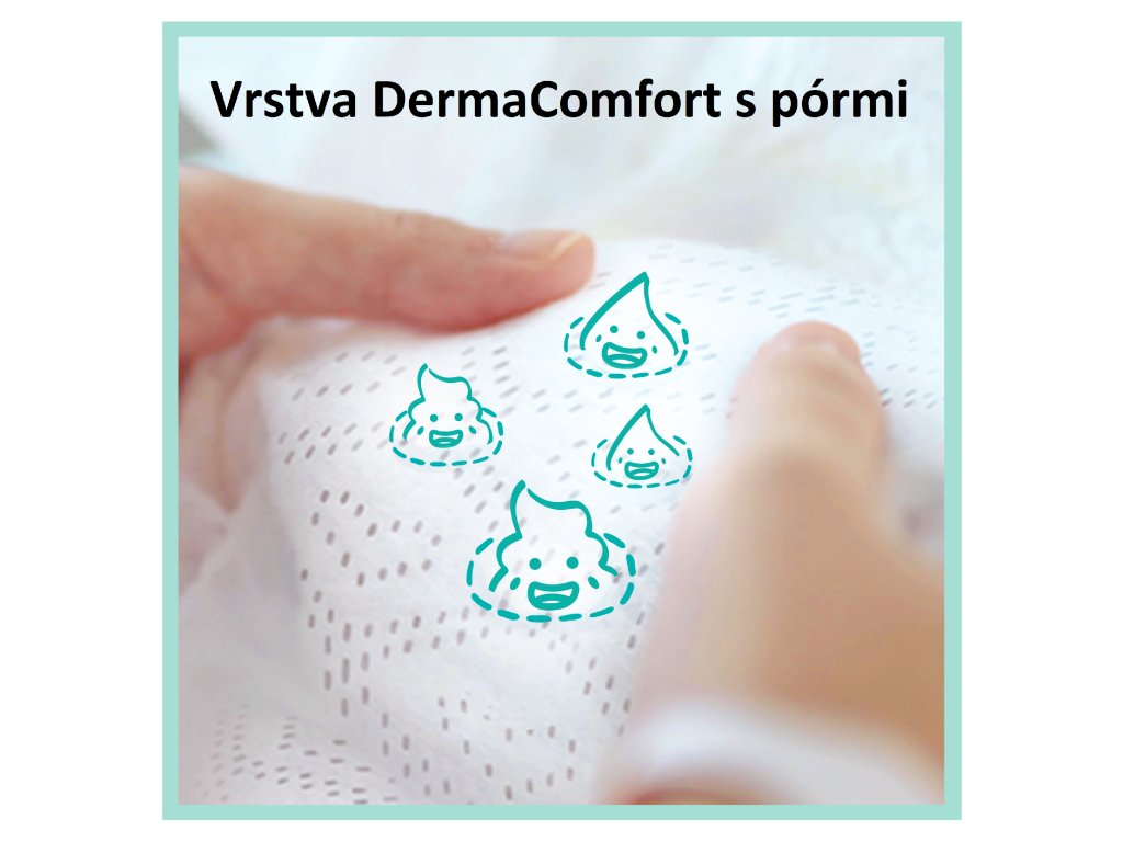 Exkluzívna vrstva DermaComfort - Vrstva DermaComfort s absorpčnými pórmi, ktoré odvádzajú vlhkosť a nečistoty od pokožky a uzatvárajú ich vo vnútri plienky.