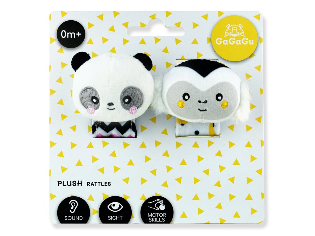 Hrkálka GaGaGu aktivuje sluch – zvuk hrkálok je mäkký a príjemný (nie príliš hlasný). Hrkálka má kontrastné farby a vzory, ktoré stimulujú zrak dieťaťa. Plyšové hlavy zvieratiek – opice a panda – nabádajú deti k ich chytaniu a podporujú cvičenie tzv. jemnej motoriky (pohyby prstov a rúk) a učenie motorickej koordinácie. Hrkálku je možné pripevniť na zápästie (špeciálnym suchým zipsom, žiadne ostré chlpy, možno ľahko zapnúť) a použiť ako bežnú hrkálku, pretože je popruh vyrobený z mäkkého materiálu a umožňuje tak dieťaťu pohodlnému uchopeniu celej hračky.